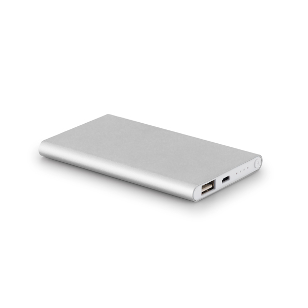 Bateria portátil slim. Alumínio. Bateria de lítio. Capacidade: 4.400 mAh. Tempo de vida ? 500 ciclos. Com entrada/saída 5V/1A. Incluso cabo USB/micro USB para carregar a bateria. 110 x 68 x 10 mm