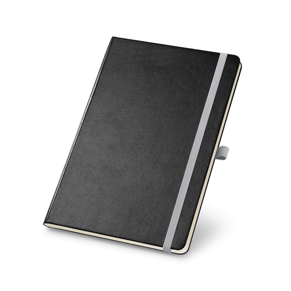Caderno capa dura. Com porta esferográfica, bolso interior e 80 folhas pautadas cor marfim. 137 x 210 mm