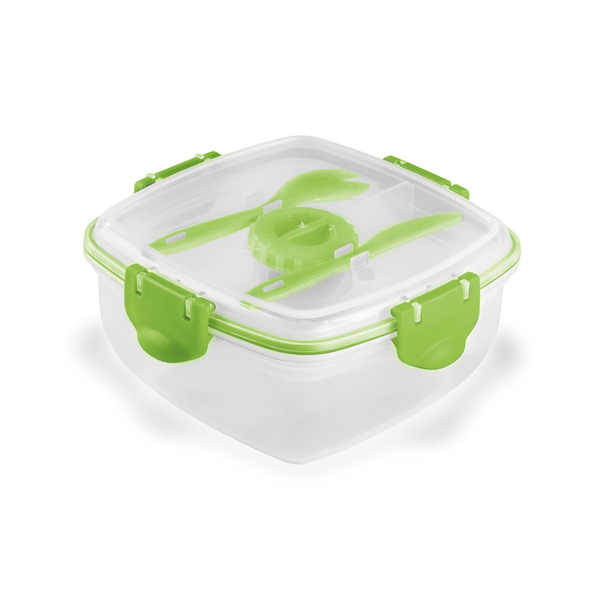 Marmita. PP. Com 3 compartimentos, garfo, faca e molheira. Capacidade total: 1.200 ml. Apta para microondas (retirar a tampa). Food grade. 175 x 175 x 87 mm
