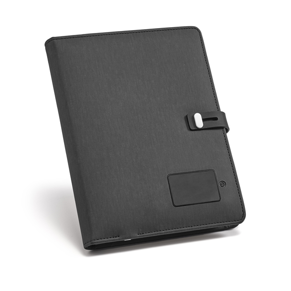Pasta A5. C. sintético. Bateria portátil embutida (lítio). Capacidade: 4.000 mAh. Tempo de vida ? 500 ciclos. Com entrada/saída 5V/1A e cabo USB/micro USB para carregar a bateria. Caderno removível: 64 folhas pautadas cor marfim. Elásticos interiores para organização e suporte para smartphone. Placa com acabamento em borracha, LED interior e botão on/off. Fornecida em caixa presente. Esferográfica não inclusa. 165 x 225 x 25 mm | Placa: 55 x 35 mm | Caixa: 180 x 240 x 35 mm